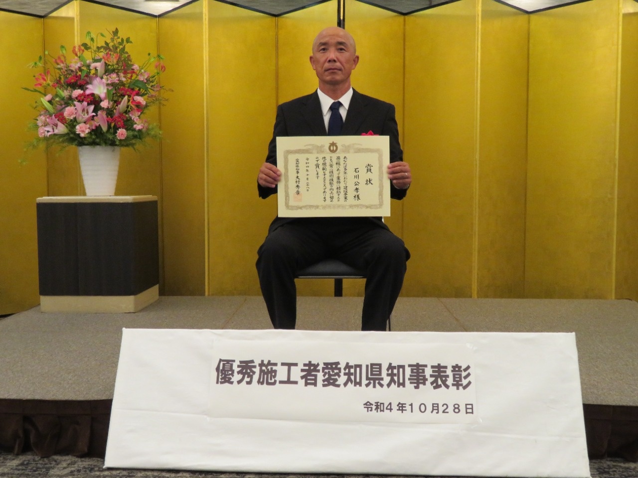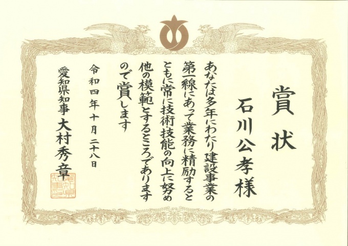 2022年10月 優秀施工者愛知県知事表彰 令和4年10月28日(金)に優秀施工者を表彰する愛知県知事表彰式典がありました。 今年も山旺建設の技術者が表彰されました。 平成24年から11年連続で表彰を戴いています。 11年連続は、県内では唯一です。 受賞者の条件 ・技術・技能が優秀である。 ・技術開発、施工の合理化を図り、顕著な成績を挙げている又は建設工事に相当の実績がある。 ・後進の指導、育成に努めている。 ・工事施工において、安全・衛生の向上に貢献している。 ・他の建設現場従事者の模範である。