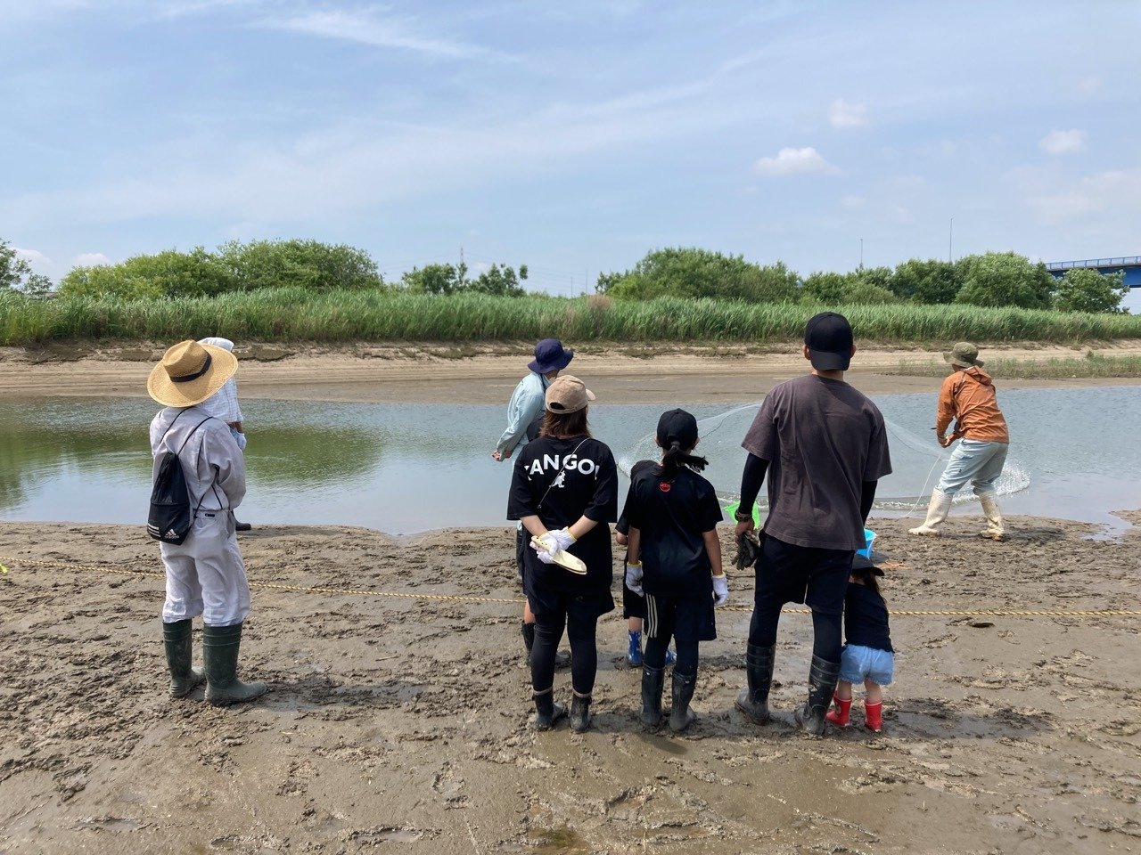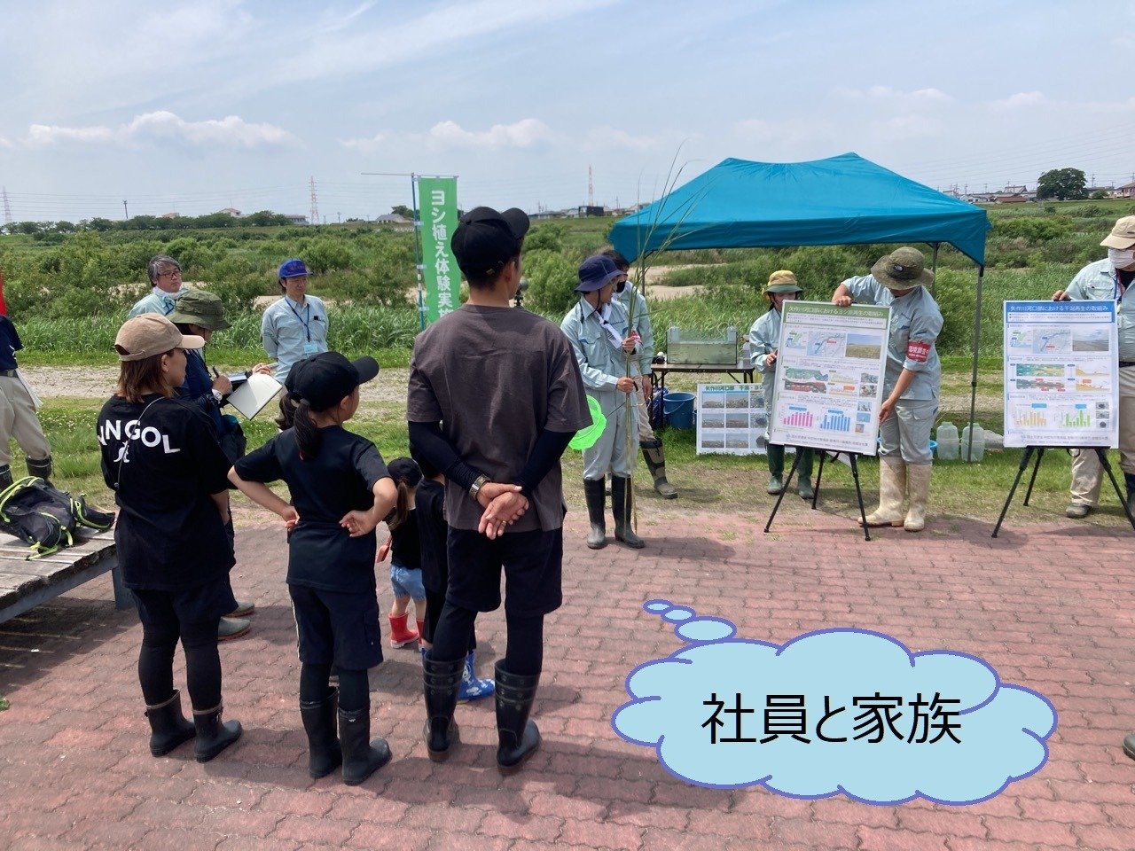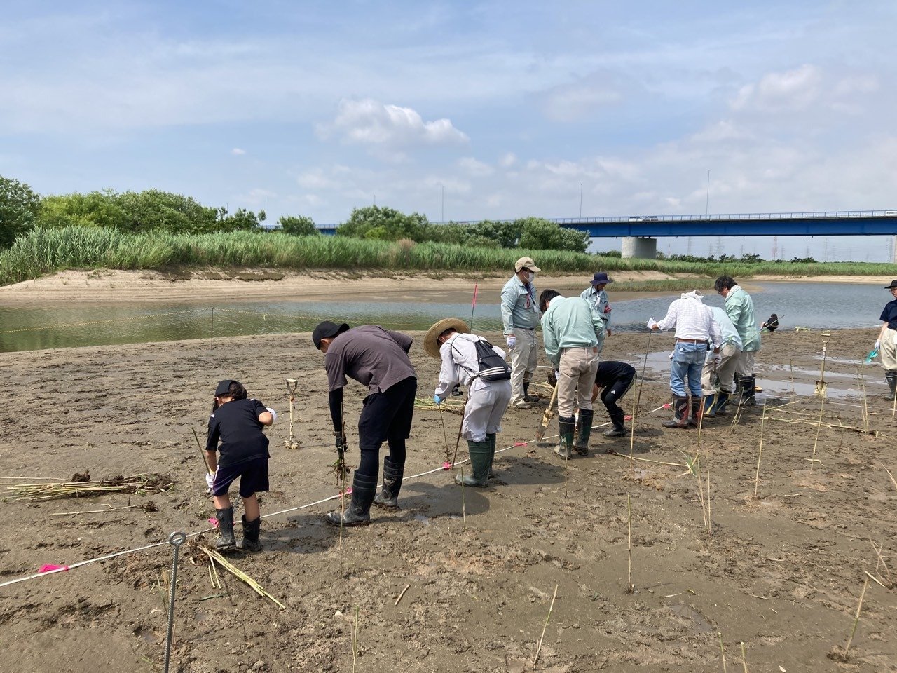 2023年06月 ヨシ植え体験会に参加しました 令和5年5月27日(土)国土交通省主催のヨシ植え体験会に、社員と家族が参加しました。 ☆ ヨシ原を復活させ、矢作川の環境を良くすることを目的にヨシ苗を植えました。 主催者より矢作川の自然環境について説明を聞きました。 ヨシ苗を植えているところです。 ☆ ヨシ原は、野鳥やカニ、小魚など多くの生物の水辺の棲みかとなるとのことです。 矢作川に生息する水生生物について説明を聞きました。 野鳥を観測しました。 投網にて小魚を捕ってくれました。 捕った小魚を説明してくれました。