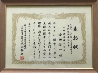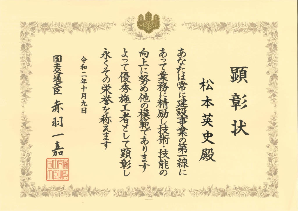 2020年11月 優秀施工者国土交通大臣顕彰 令和2年11月20日に国土交通大臣による優秀施工者の顕彰を受けました。 例年は東京で顕彰式がありますが、新型コロナウィルスの影響で顕彰式が開催されず、 国土交通省の方が山旺建設の本社にて顕彰状を授与する形式になりました。 山旺建設として5人目の受賞です。 日々の努力を評価されての受賞です。
