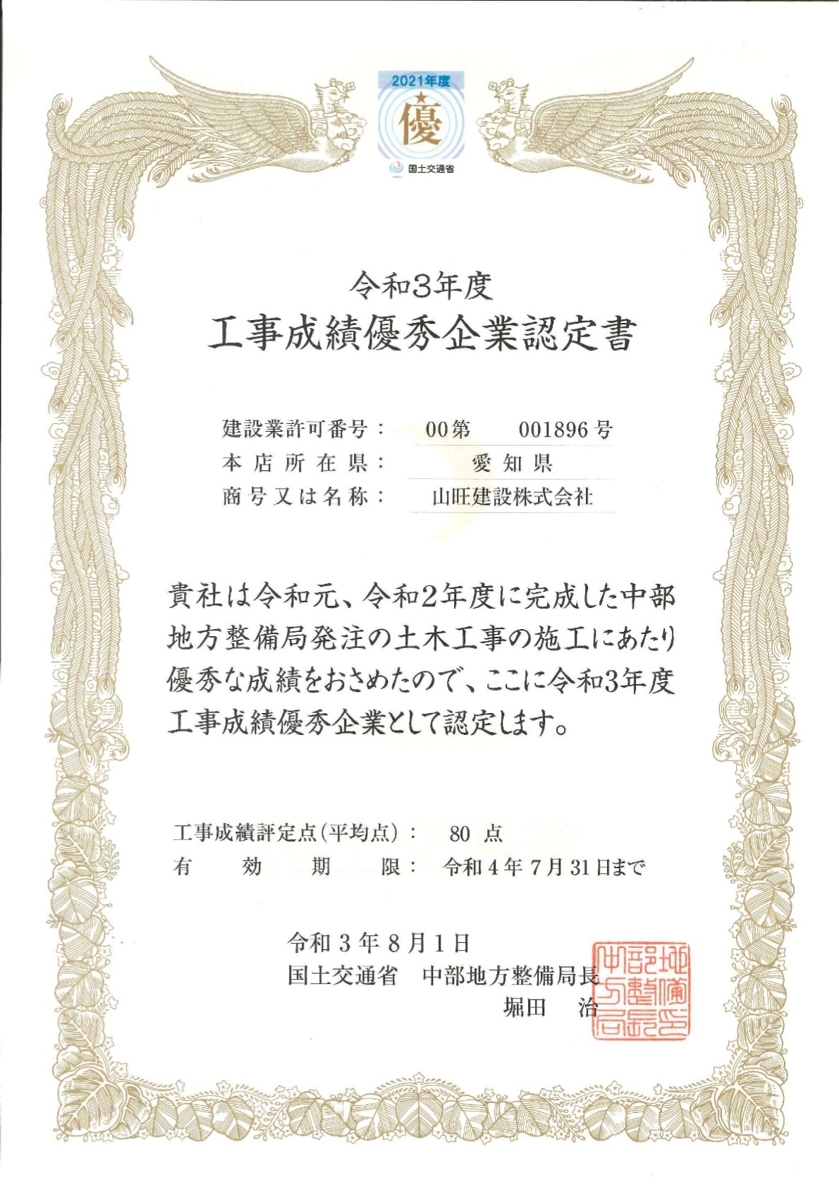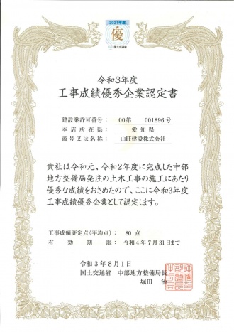 2021年08月 国土交通省 中部地方整備局「工事成績優秀企業認定」 令和3年8月1日に国土交通省 中部地方整備局長より、「工事成績優秀企業」認定書が授与されました。 「工事成績優秀企業」認定は、国土交通省中部地方整備局が工事成績評定の優秀(過去2ヵ年の平均80点以上)な企業を認定するものです。 認定を受けると、「工事成績優秀企業認定シール」を使用する事ができ、「工事成績優秀企業認定ロゴマーク」を名刺等に印刷することができます。 また、中部地方整備局及び事務所発注工事における総合評価落札方式の審査において 加点の対象となります。