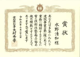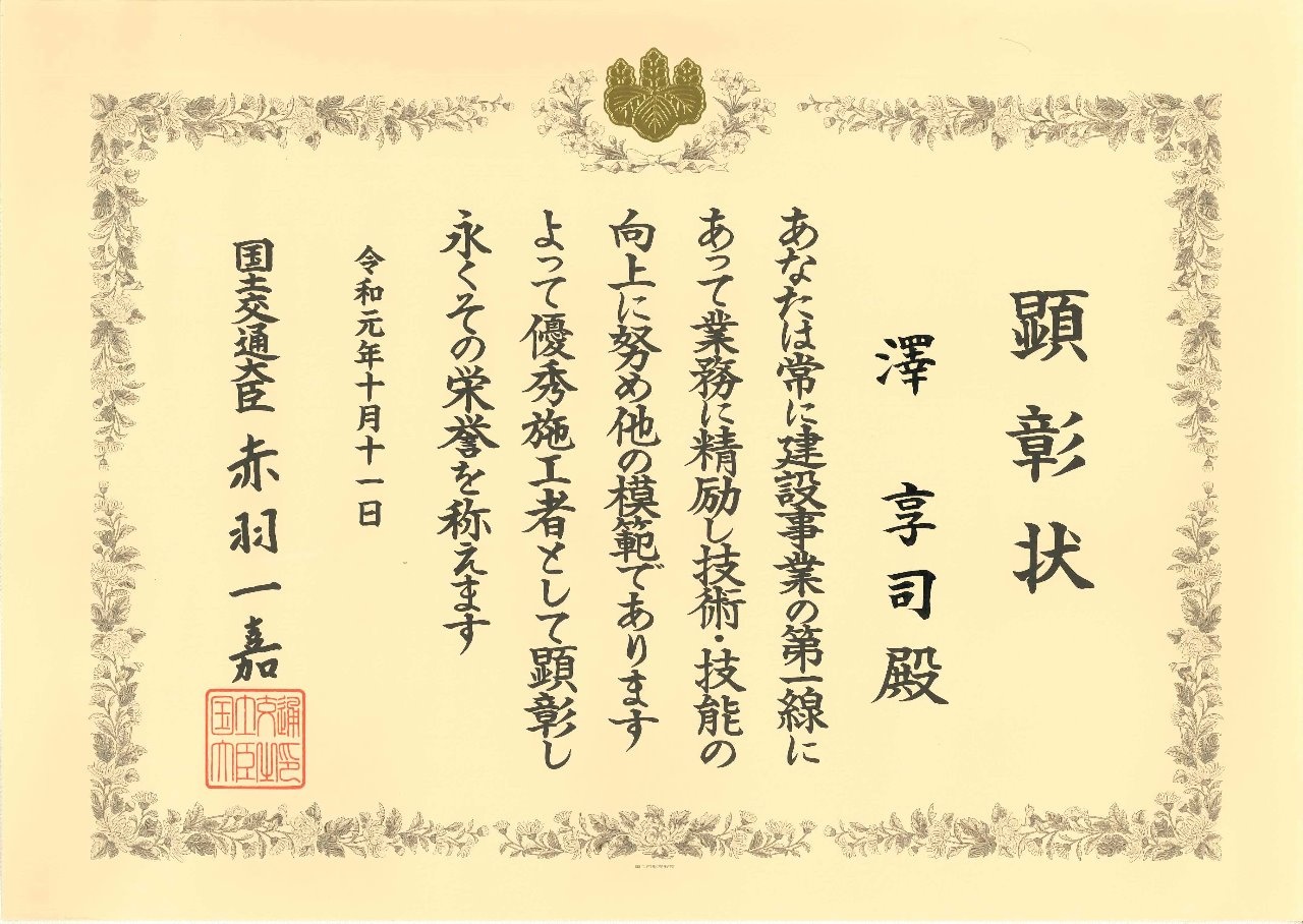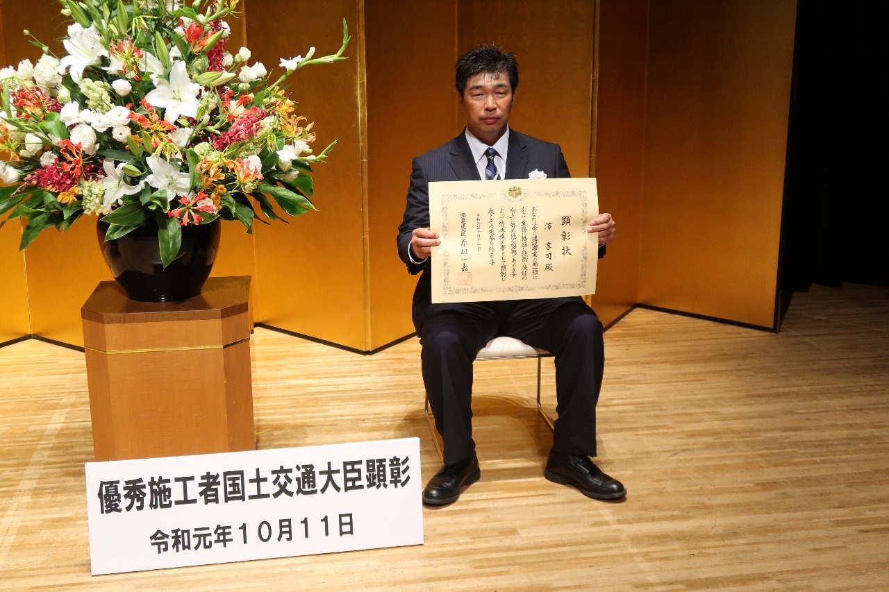 2019年10月 優秀施工者国土交通大臣顕彰 令和元年10月11日に国土交通大臣による優秀施工者顕彰式が東京であり、山旺建設の社員が顕彰を受けました。 山旺建設として4人目の受賞です。 日々の努力を評価されての受賞です。