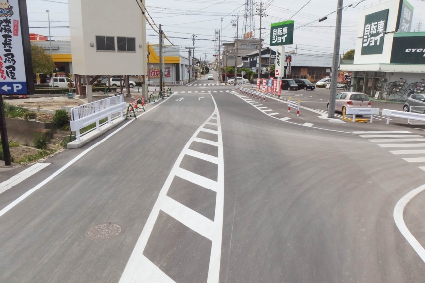 道路改良工事 西尾市からの発注工事で、平成26年3月に完成。道光寺戸ケ崎1号線(道光寺町付近)の道路の補修、拡幅工事です。隣接するスーパーのオープン時期に合わせての短納期施工でしたが、従事者全員のたゆまぬ努力で無事に完成出来ました。
