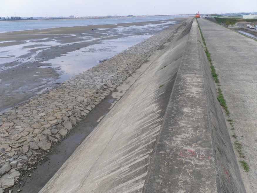 海岸整備事業 西尾地区 堤防工その30工事 及び 緊急海岸整備事業 西尾・幡豆4期地区 西尾海岸その4工事 愛知県西三河農林水産事務所からの発注工事で、平成28年4月に完成。西尾市南奥田町の矢作川堤防の耐震補強工事です。堤防の地盤が軟弱であるため、河川内に仮設道路を作り、7mの砂杭を239本打設して軟弱地盤を固めます。大きな杭打機を搬入させるために、かなり大掛りな仮設ヤードを作りました。現場は強風で大変苦労しましたが、無事に完成出来ました。