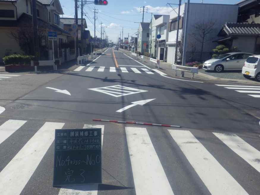 舗装補修工事 西尾市発注の切削オーバーレイでの舗装工事です。現場は西尾市永吉二丁目外1町地内で工事延長が260m、面積が1,338㎡です。工事範囲には交差点も含まれており、そのうえ工事箇所の周辺の道路は一方通行が多く、迂回がしにくい状況であったため予告看板を多めに設置し、少しでも渋滞が緩和されるよう努力しました。施工当日は苦情、事故等はなく無事に工事を完成することが出来ました。