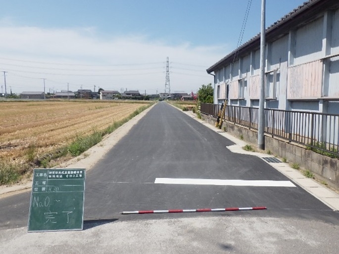 本工事は愛知県西三河農林水産事務幡豆農地整備出張所発注の舗装工事です作業は掘削→路床改良→路盤→表層→路肩処理の工程にて作業をしていきますこの現場での一番大変だったのは路床改良のセメント敷均しです、風が強い日は周囲に飛散しないようにシートを用いて養生し大変でしたが、周囲を汚すことなく無事に工事を完成することができました