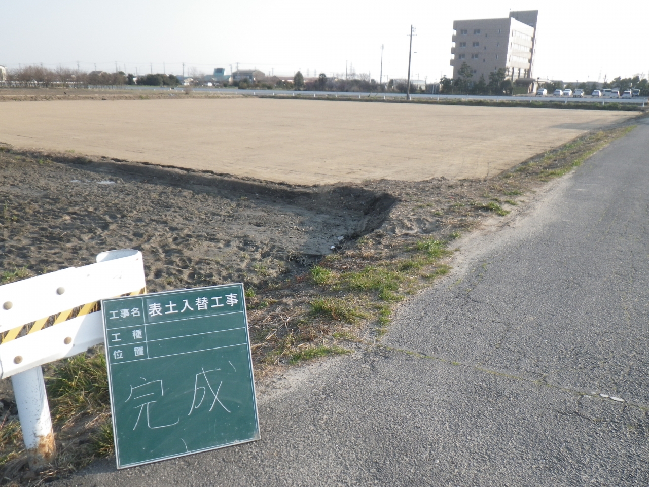 表土入替工事 西尾市教育委員会発注の西三河南部地区新設特別支援学校(仮称)設立のための表土入替工事です。約8,550㎡の耕作土を必要箇所に運搬し、他工事の発生土で盛土を行いました。場内市道を通行させながらの工事であったため、一般車両の通行の妨げを軽減するために土運搬は、4tDTで行いました。施工時期的にも雨天が多く天候を考慮しながらの工事となりましたが、無事故で竣工出来ました。