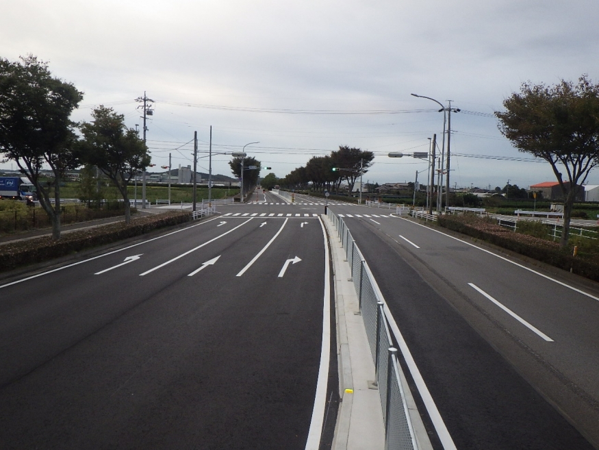 本工事は、国道23号バイパス西尾東インターチェンジから南下する主要幹線道路(一般県道蒲郡碧南線)の片側2車線にする工事です。沿線には大手物流センターがあり、大型トラックの通行が多く施工前は、物流センターへ入る車と通過する車とで大渋滞を起こし通行の難所となっていました。施工は、既設の中央植栽帯を撤去し、新しく中央分離帯を設け、車線数を増やし、拡幅部は、規定の舗装構成で施工し、現道部が路上再生路盤を施工し強度を確保しました、交通量が非常に多く昼間での施工が出来ないため、夜間施工しました。車線数を増やすと共に左折車線を設け物流センターへの通行を分離することにより通過車両がスムーズに通行することができるようになりました。