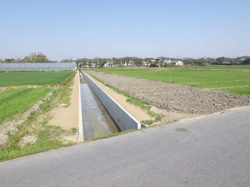 平成29年度 単独土地改良事業 かんがい排水 水路改良工事 西三河南部土地改良区より発注された水路改修工事です。延長約150mの組立水路を取壊し、L型水路に改修するにあたり、沿線の農地を借地し、仮設道路を作ることから始まりました。上流区域の雨水、排水が集まる水路の為、一雨降ると現場内が水没するという悪条件でしたが、無事事故もなく、大変きれいに施工することができました。