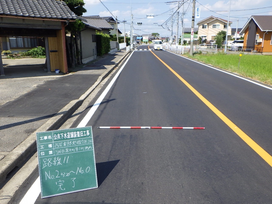 西尾市発注の公共下水道舗装復旧工事です。施工箇所が西尾市深池町、菱池町地内で工事延長が1,417m、舗装面積が4,302㎡です。本工事は下水管布設後の仮舗装を撤去し、新しく舗装を打ち直すという工事です。施工箇所が住宅街で基本的に重機作業となるため民家や塀などに傷をつけないよう細心の注意を払い、作業に努めました。地元の方には道路規制や重機の振動、騒音等でご迷惑をおかけしました、