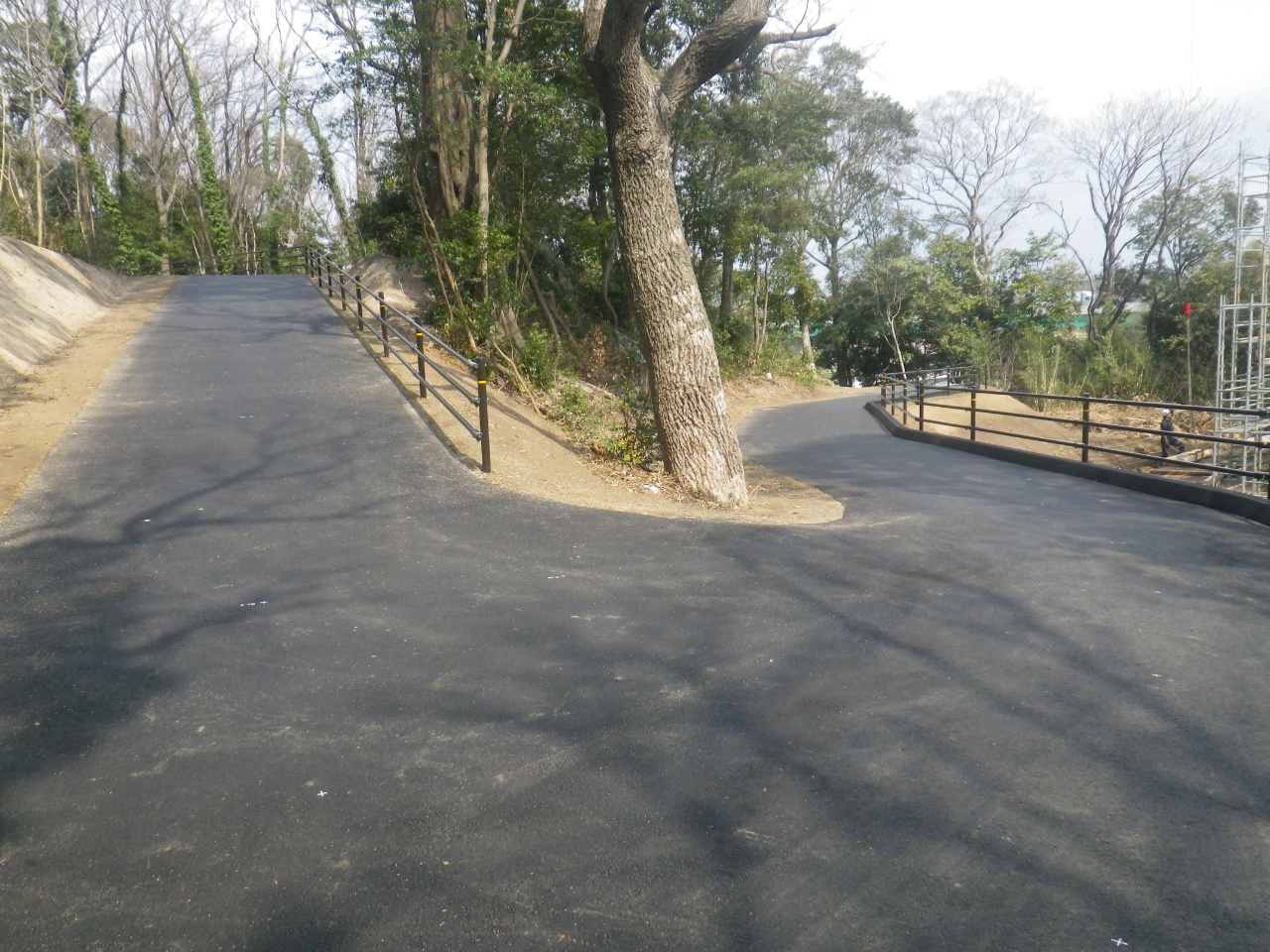 園路整備工事 この工事は岡ノ山インター(遊ぼっ茶広場)から八ツ面山公園へ行ける遊歩道になります。この道を切り開く前は、歩道が無い箇所を長く歩かないと八ツ面山には行けませんでしたが今は遊ぼっ茶広場よこの橋を渡ると遊歩道への入口が見えます。ウォーキングコースにはちょっと不向きな急こう配の坂がありますが、足腰を鍛えるには丁度よいと思いますので、ぜひ散歩してみてください。