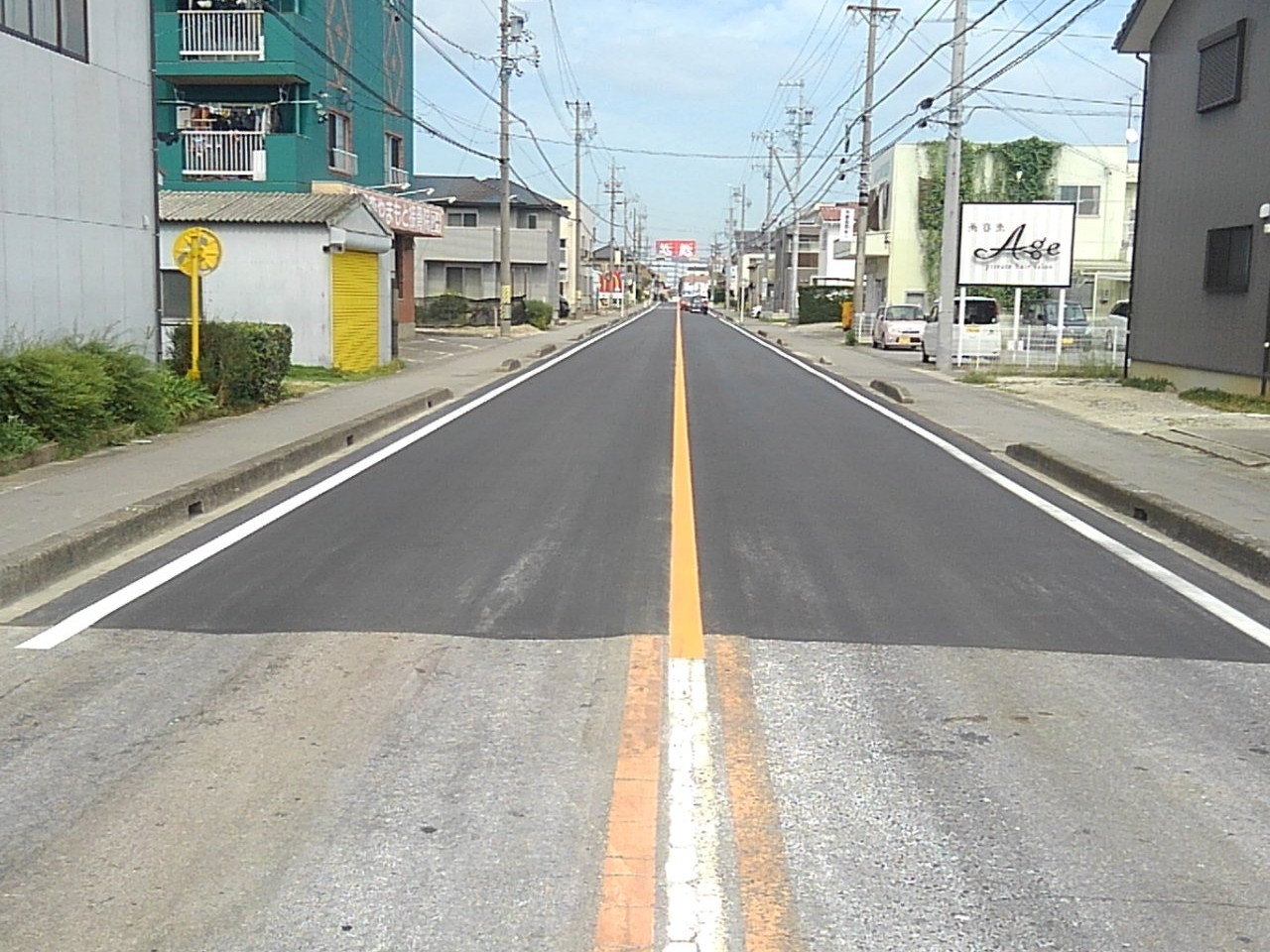 舗装道修繕工事(西尾その2)(一般県道刈宿住崎線) 愛知県西三河建設事務所発注の舗装道修繕工事です。現場は一般県道刈宿住崎線の西尾市新在家町地内で西尾市内と一色町を結ぶ、交通量の非常に多い箇所です。工事内容は傷んだ舗装下の路盤にセメントを敷均し大型重機で混合して強固な路盤を作り舗装を新しくするといった内容です。夏期の暑い中での舗装工事は熱中症と隣合わせで大変苦労しましたが、真新しいアスファルトを見るとそんな苦労もいい思い出となりました。
