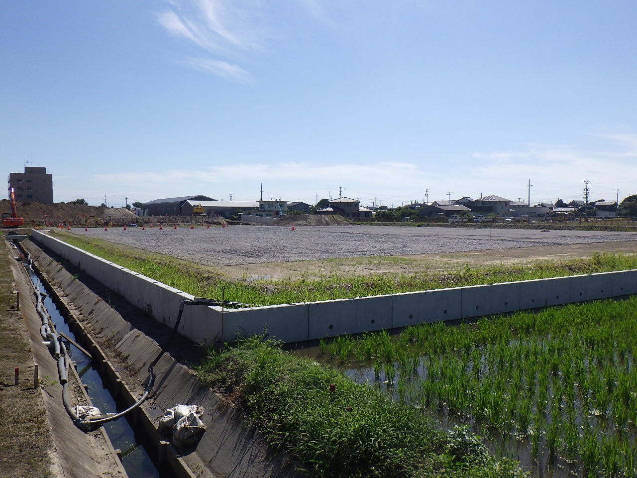 用地造成工事 本工事は西尾市発注の造成工事です。用地には西尾市の旧三町(一色町、吉良町、幡豆町)の小・中学14校の給食を供給する施設を構築する場所となります。田畑の場所を盛土し、約8か月間の沈下期間を設けた後、境界沿いにL型擁壁を施工しました。工期が16か月と長かったですが、協力業者のおかげで無事故・無災害で完了することができました。