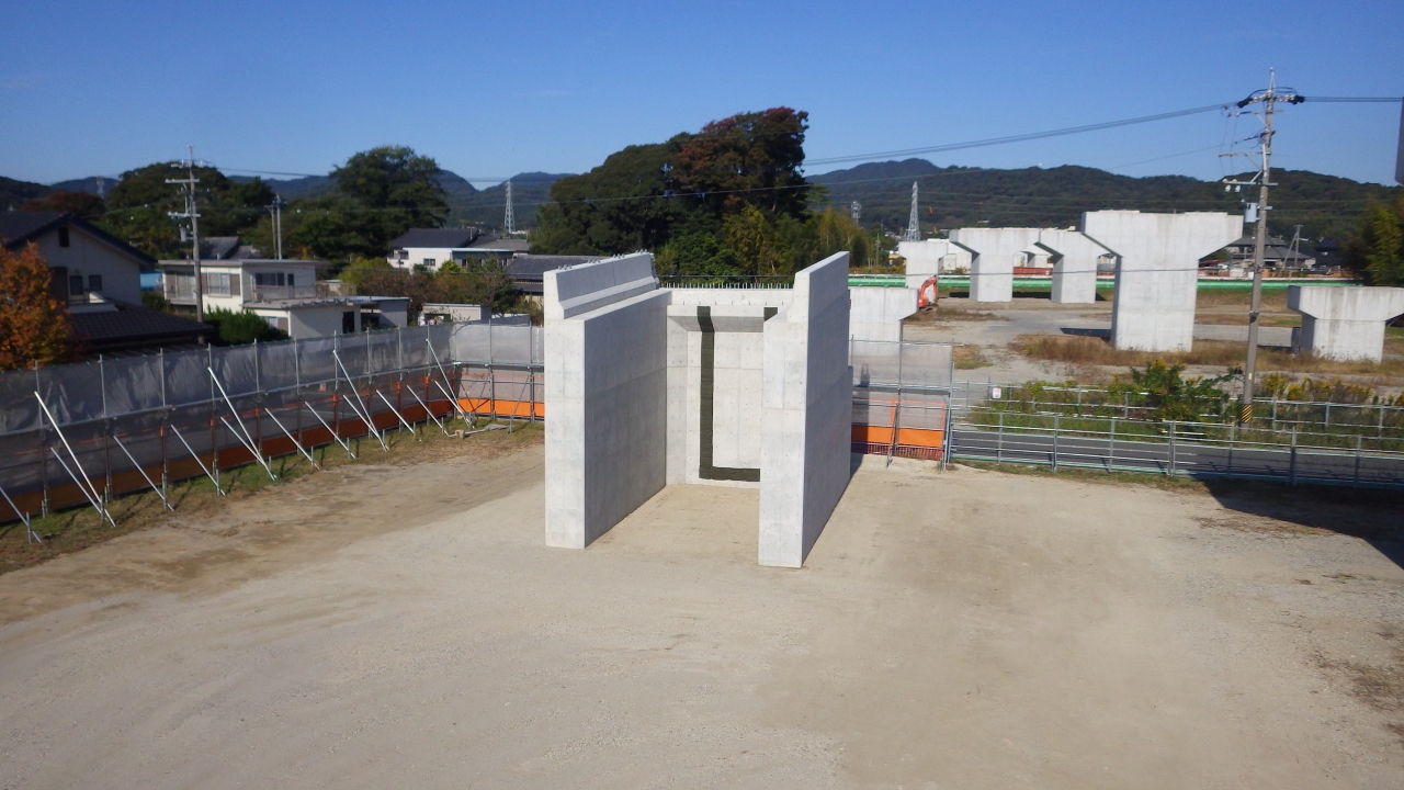 令和元年度 23号蒲郡BP金野高架橋下部工事 国土交通省名四国道事務所発注の工事で、23号蒲郡バイパスの橋台3基、擁壁2基を施工しました。民家の近くでの工事であり、騒音や振動など近隣の方に迷惑にならないよう注意を払い施工を行いました。協力業者の皆様の協力もあり、品質の良い構造物を無事故、無災害で完成させることができました。