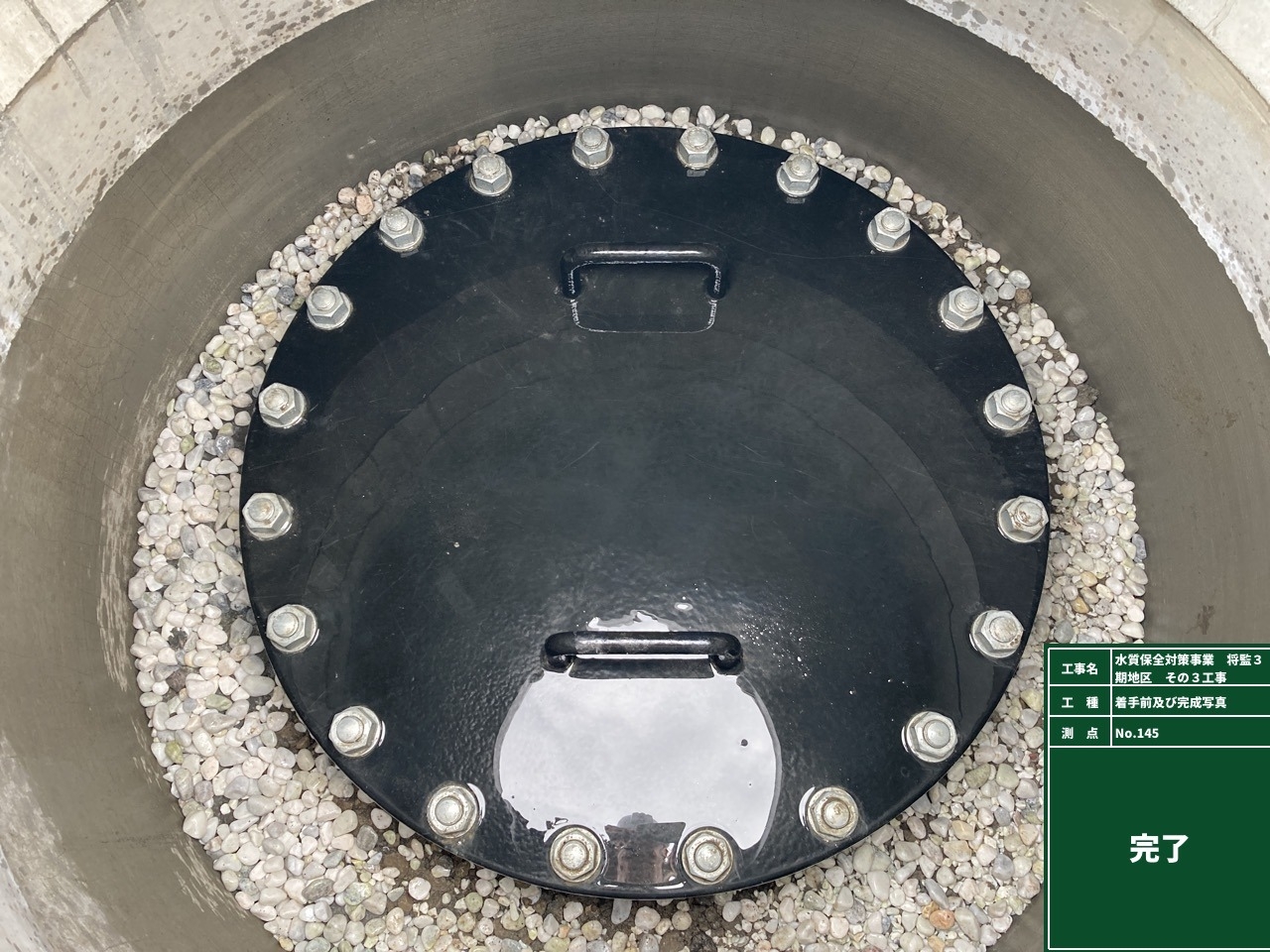 水質保全対策事業 将監3期地区 その2工事・その3工事 本工事は、愛知県西三河農林水産事務所発注の工事であり西尾市住崎町から国森町において農水管の老朽化に伴う管更生工(SPR工法:L=250m)および、監査用人孔(1箇所)設置を行いました。工事を行うにあたり、現道規制(通行止め・片側交互通行)、住崎2号公園内を一部占用しての工事となったため、特に第三者に対する安全管理に十分配慮し、工事を進めました。また、管更生工事では管内作業となるため、日々の酸素濃度、有害ガスの有無の測定・換気を徹底して行い労働災害もなく無事工事を完成することが出来ました。