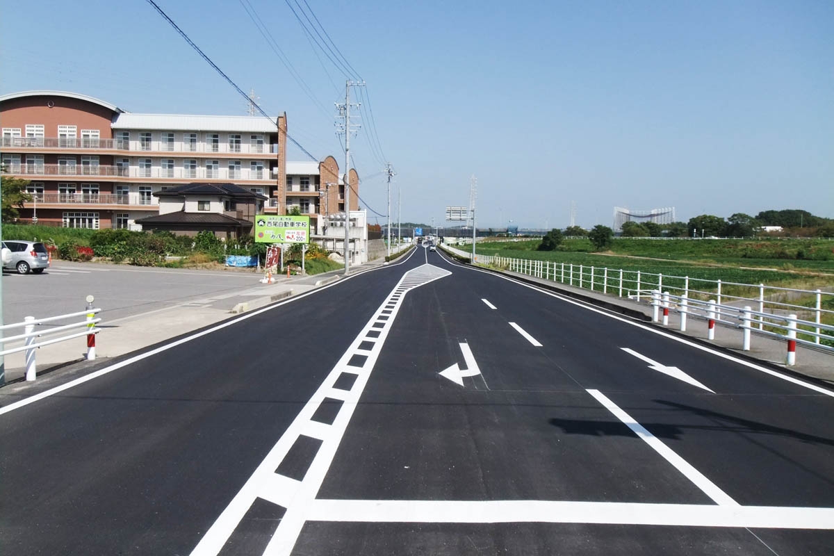 舗装道修繕工事(西尾その2) 愛知県からの発注工事で、平成26年11月に完成。県道熊味岡崎線(八ツ面町地内)の老朽した道路の舗装を現地混合にて補修する工事です。工事施工時期は雨天の日が多く、高校生の往来が多い通りでしたのでドロドロ状態の道路が気になり度々水替え・整地を行い無事に工事を完成出来ました。