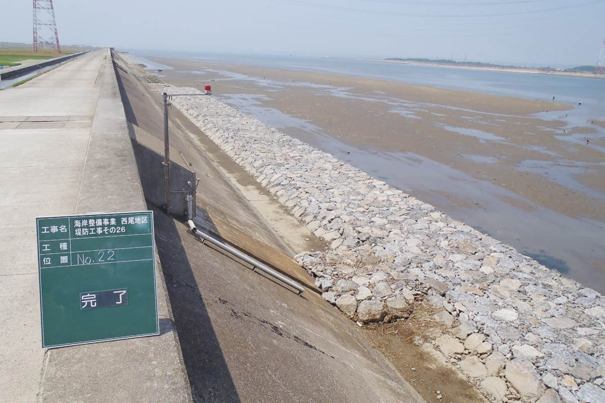 海岸整備事業 西尾地区 堤防工その26工事 愛知県からの発注工事で、平成26年5月に完成。 西尾市南奥田町の矢作川堤防の耐震補強工事です。堤防の地盤が軟弱であるため、河川内に仮設道路を作り、7mの砂杭をバイブロハンマーで打設して軟弱地盤を固めます。今回は、排水ポンプのある場所だったので、施工が大変でした。また海岸線の為、風が強く苦労しましたが、無事に完成出来ました。