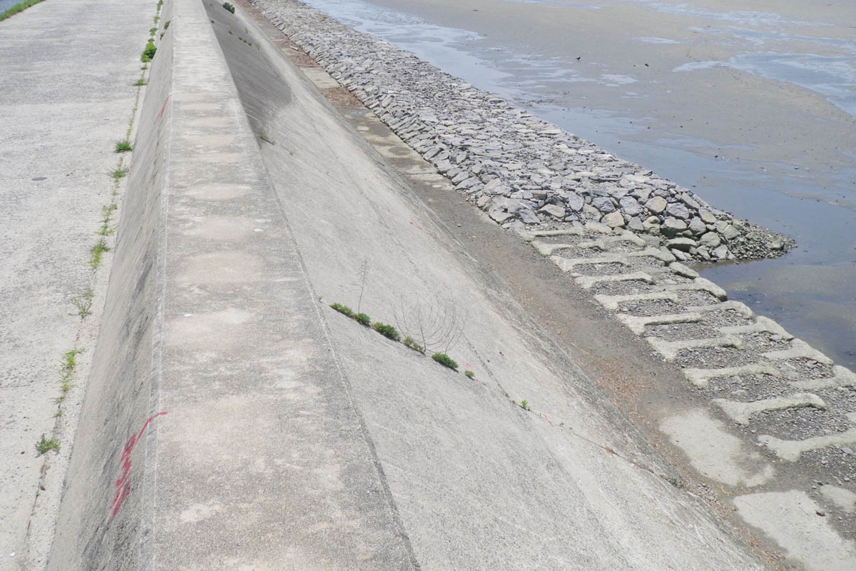 海岸整備事 西尾地区 堤防工その27工事 愛知県からの発注工事で、平成26年5月に完成。西尾市南奥田町の矢作川堤防の耐震補強工事です。昨年施工の26工事の続きになります。堤防の地盤が軟弱であるため、河川内に仮設道路を作り、7mの砂杭をバイブロハンマーで打設して軟弱地盤を固めます。大きな杭打機を搬入させるために、かなり大掛りな仮設ヤードを作りました。現場は風が強く大変苦労しましたが、無事に完成出来ました。