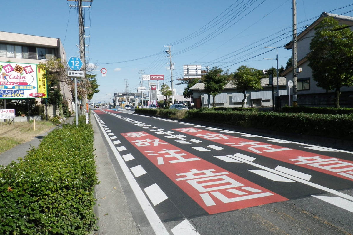 交差点改良工事(交付金) 愛知県からの発注工事で、平成25年11月に完成。豊田一色線(西尾市新渡場町地内)の道路を補修するとともに交通事故防止対策の一環として、道路の危険箇所をカラー舗装する工事です。交通量の多い所での施工でしたが、無事に工事を完成出来ました。