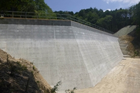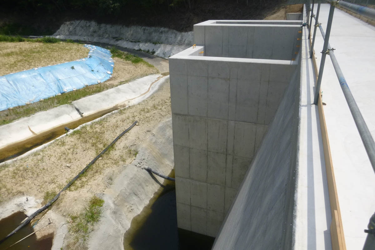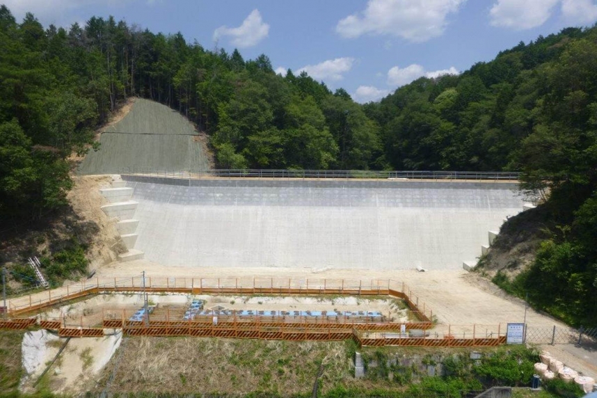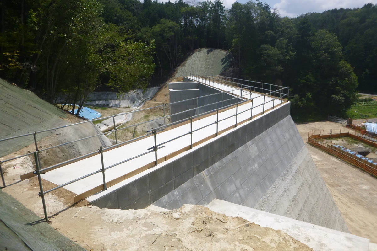 内陸用地造成事業 豊田・岡崎地区 中工区 調整池築造工事その2 愛知県からの発注工事で、平成26年7月に完成。トヨタ自動車のテストコースに関連した工事です。環境保護を考慮し現場周辺の自然環境に悪影響を及ぼさないよう堰堤を構築しました。ただし現場付近にはお店がなく、担当者(現場所長)には不都合な場所でしたが無事に完成出来ました。