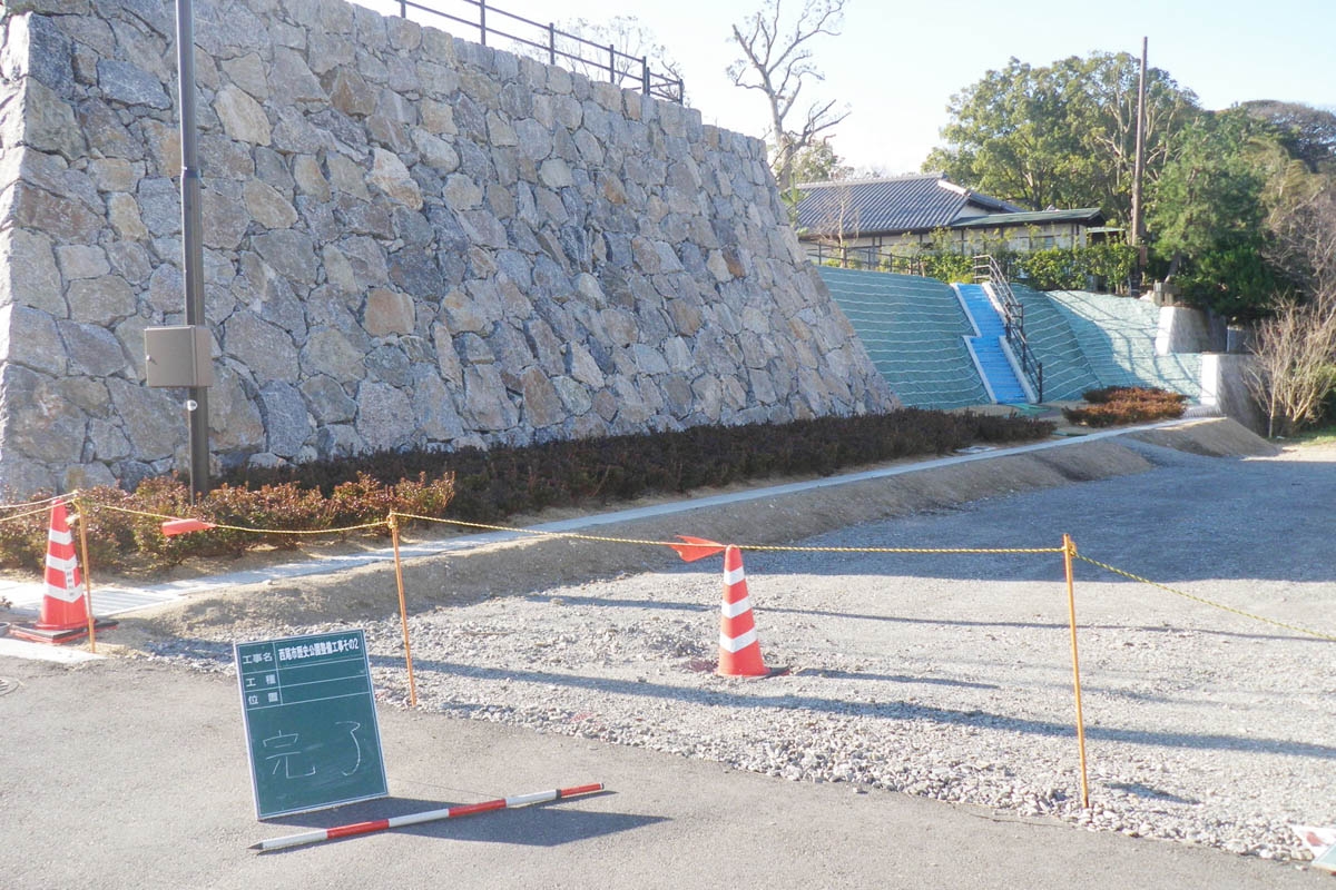 西尾市歴史公園整備工事その2 西尾市からの発注工事で、平成26年3月に完成。 西尾城の石垣復元の一環として石垣廻りの公園整備を行う工事です。公園内芝生広場では、西尾市民のイベント開催に利用が可能な設計に配慮されています。歴史を感じるもの創りが出来た現場で無事完成出来ました。