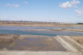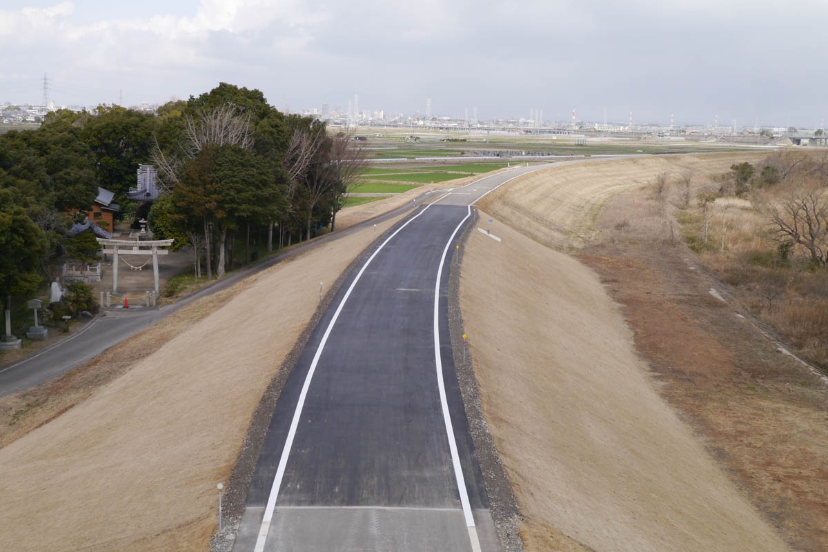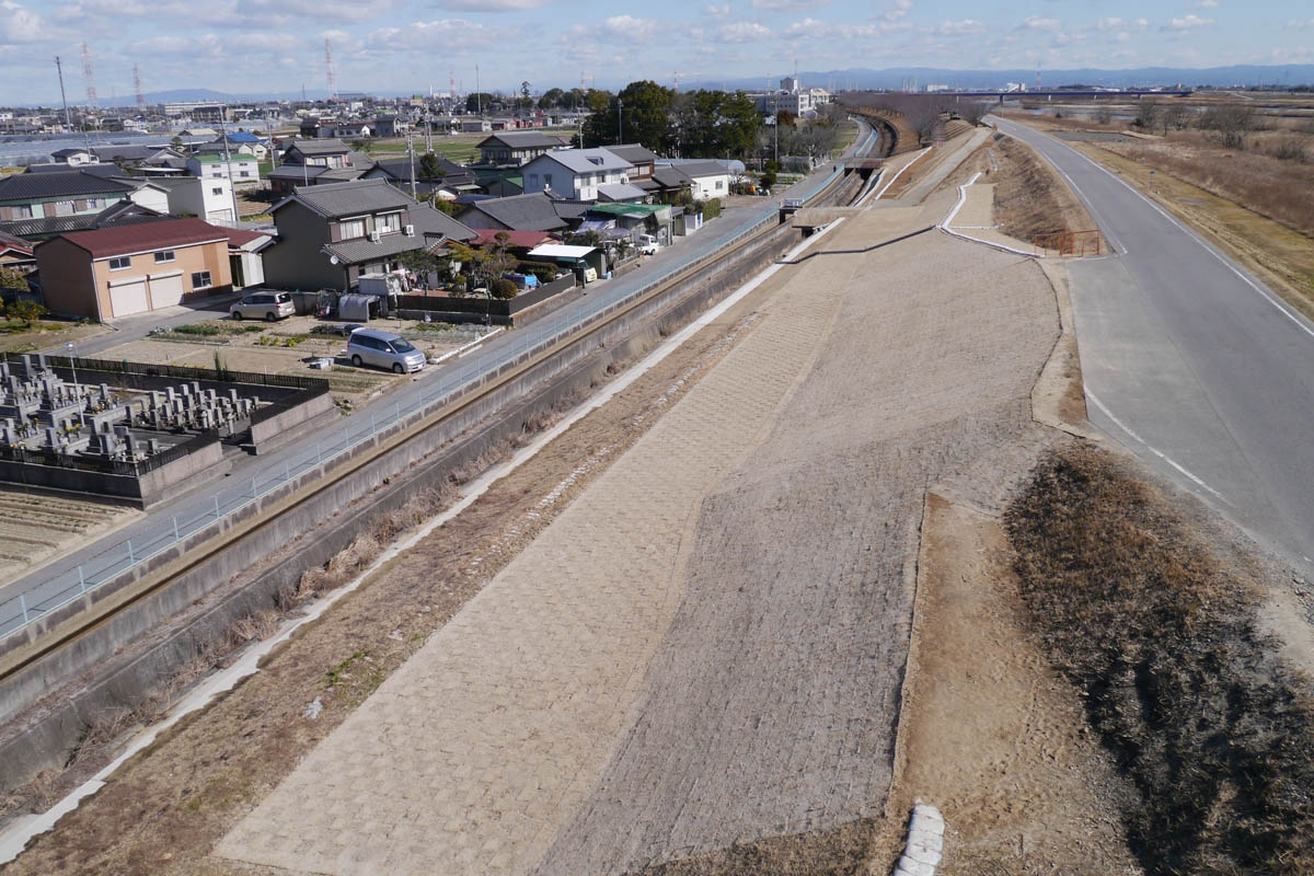 平成26年度 矢作川下流部堤防整備工事 国交省からの発注工事で、平成27年3月に完成。上流部は堤防断面が不足する区間の築堤(かさ上げ、拡幅)工事で、下流部はヨシ原の再生工事と堤防のリフレッシュ工事です。工事施工中は風が強く、なおかつ渇水時の冬期である為に、寒さが身にしみましたがかぜをひくことなく完成出来ました。