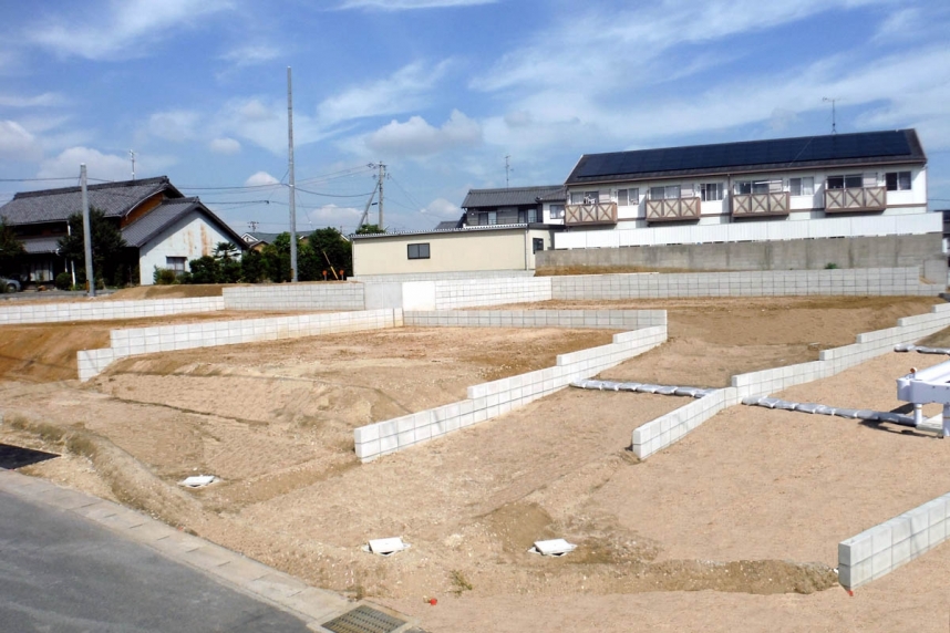 西尾市新在家町地内造成工事 個人からの発注工事で、平成26年12月に完成。西尾市新在家町の高低差のある450坪の宅地を造成し、6区画に分譲する工事です。お施主さんとの相談、設計、開発手続き、道路の寄付採納などすべての手続きを依頼され、大変苦労しましたが無事に完成出来ました。