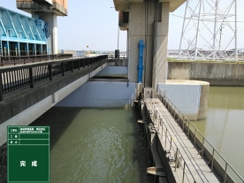 海岸整備事業 幡豆地区 北浜川水門その2工事 本工事は愛知県発注の北浜川最下流の水門耐震工事です。前年度は右岸側を施工しましたが、今回は左岸側水門の耐震工事を施工しました。前回と同様に水門の上下流部を仮締切りを設置して、水門内の水替えを行い、ドライな状態で施工を行いました。同様な工事内容とはいえ、施工手順の再確認や入念な打ち合わせを行い、協力業者皆さんのおかげで無事故・無災害で完了することができました。
